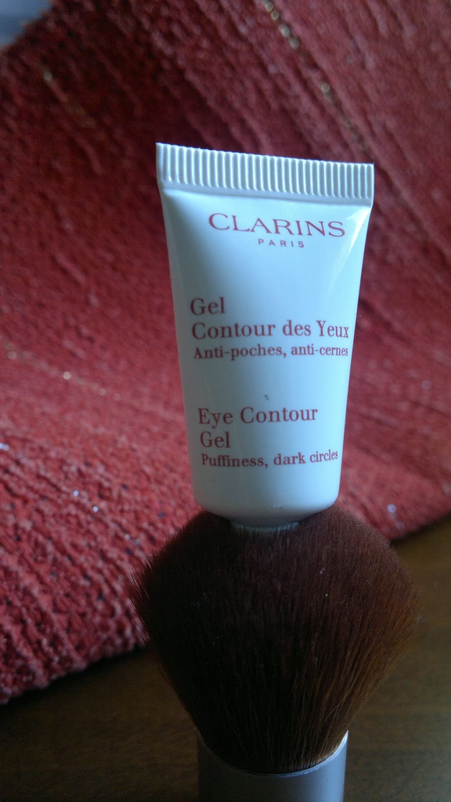 Clarinsin silmänympärysvoide Eye Contour Gel lykättiin mukaani Sokokselta. Näytin varmaan jotenkin nuutuneelta, koska tämän voiteen pitäisi vähentää silmien turvotusta ja mustia silmänalusia. Koostumus on geelimäinen ja levittyy sekä imeytyy ihan mukavasti. Turvotukseen tai silmänalusiin se ei kyllä vaikuttanut pätkääkään. Tätä tuskin ostaisin.